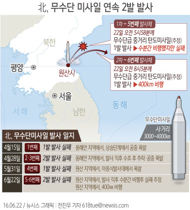 합동참모본부에 따르면 이 중 먼저 발사된 미사일은 실패한 것으로 분석됐으나, 뒤이어 발사된 미사일은 약 400㎞를 비행한 것으로 전해졌다. 북한의 무수단 미사일 발사는 이날만 두 번째이자, 올해 들어 총 여섯 번째다.