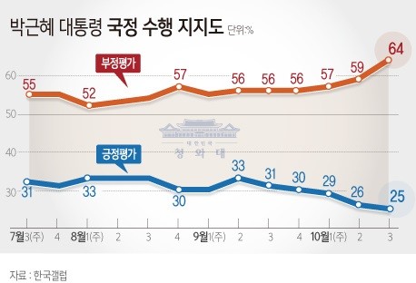 한국갤럽이 전국 성인남녀 1,018명을 대상으로 조사해 21일 발표한 10월 셋째 주 주간 집계 결과에 따르면 박 대통령의 직무수행에 대한 긍정평가는 25%로 지난주에 비해 1%포인트 하락했다.
