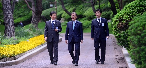 | ▲ 문재인 대통령이 15일 청와대 관저를 나와 주영훈(왼쪽) 경호실장, 송인배 전 더불어민주당 선대위 일정총괄팀장과 여민관 집무실로 출근하고 있다. | ||