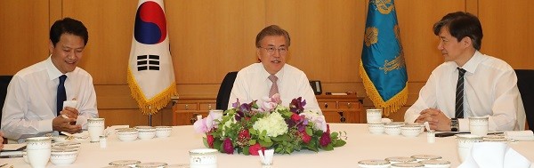 | ▲ 문재인 제19대 대통령이 지난 11일 오후 청와대에서 청와대 참모진과 오찬에 앞서 대화하고 있다. | ||