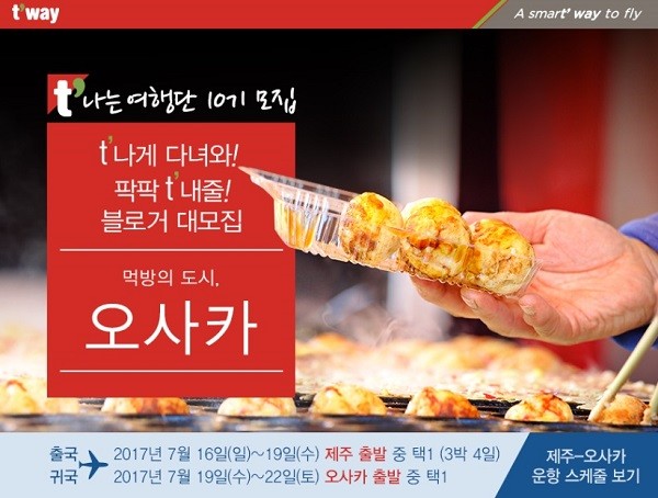 [일요주간=김지민 기자] 티웨이항공이 새롭게 취항하는 제주-오사카 노선을 기념해 't(티)나는 여행단‘ 10기를 모집한다.