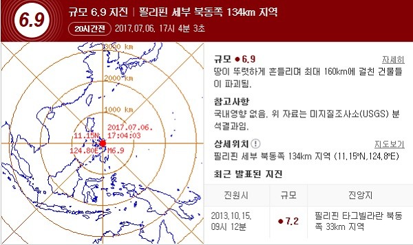 한편 우리 외교당국에 따르면 현재까지 한국인 교민 피해는 없는 것으로 파악됐다. 기상청은 미국 지질조사소(USGS) 분석 결과를 토대로 “필리핀에서 발생한 강진이 국내에 영향을 미치지는 않는다”고 밝혔다.
