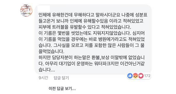 또 A씨는 "기계를 작동하는 기름이 어떻게 인체에 무해하지 않겠느냐"면서 "환불·보상이 중요한 것이 아니라 정확한 기름 성분과 인해 유해성부터 밝혀야 한다"고 따졌다. A씨 외에도 이용객중 일부는 병원에서 치료를 받는 등 피해를 봤다며 롯데워터파크 측에 항의했다. 홈페이지 ‘고객의 소리함’에도 잇딴 항의가 계속되는 것으로 보인다.