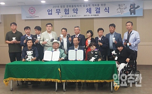 [일요주간=노세중 기자] 강원도(도지사 최문순)와 한국장애인 문화예술단체총연합회(상임대표 안중원)는 25일 오후 4시께 서울 여의도 이룸센터에서 2018평창동계올림픽 및 동계패럴림픽 대회의 성공 개최를 위한 문화올림픽 활동에 공동 협력하고자 협약을 체결했다.