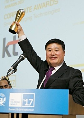 KT는 28일 오후 부산 해운대 벡스코에서 열린 ‘ITU 텔레콤 월드 어워즈 2017’의 정보통신 기반 가장 우수한 기업에 주는 글로벌 코퍼레이트 어워즈 부문에서 ‘스마트 기술 혁신상’을 받았다.