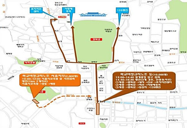 24일 서울경찰청에 따르면 학교비정규직노조 등은 25일 오전 7시부터 오후 1시까지 청계광장 앞 인도와 하위 3개차로 위에서 무대설치 및 집회를 준비한다. 또 오후 1시부터 4시30분까지 최대 1만명이 세종대로 진행방향 전차로(시의회 횡단보도→세종로 사거리 방향)에서 집회를 연다. 이어 세종대로·사직로·율곡로 진행방향 전차로를 이용해 거리 행진을 벌인다.