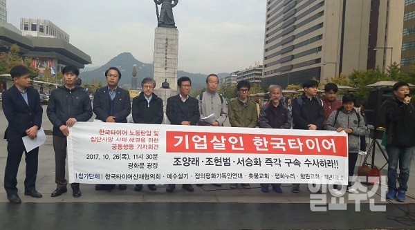 이 날 기자회견에는 한국타이어의 노동탄압과 집단사망 사태 해결을 위한 공동행동이 나섰다. 공동행동에는 한국타이어 산재협의회를 비롯한, 예수살기, 정의평화기독연대, 촛불교회, 평화누리, 향린교회, 희년사회 등 10개의 종교단체가 참여했다.