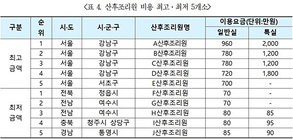 반면 가장 저렴한 산후조리원은 전북 정읍 H산후조리원과 전남 여수 G산후조리원으로, 특실 없이 일반실 이용요금으로 70만원으로 받고 있었다.