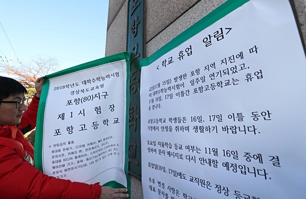 [일요주간=최종문 기자] 15일 포항에서 발생한 규모 5.4 지진 여파로 16일로 예정됐던 ‘2018학년도 대학수학능력시험’이 23일로 일주일 연기됐다. 재난재해로 수능이 연기된 것은 이번이 처음이다.