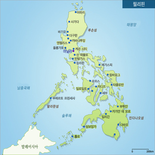 동남아시아에 위치한 군도국가인 필리핀은 북부의 루손, 중부의 비사야, 남부의 민다나오의 크게 3개 지역으로 분류된다. Philippines는 '스페인 국왕 펠리페 2세의 백성(Filipinas)'이라는 뜻이다. 한자로는 比律賓(비율빈)이라고 표기한다.