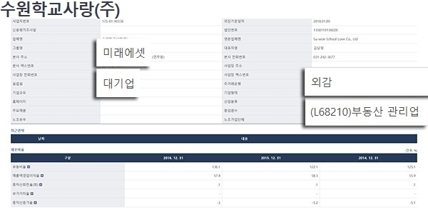 ▲미래에셋생명 자회사 부동산사모투자회사 미래에셋맵스프런티어가 만든 여러 부동산 펀드의 부동산 자산은 수원사랑학교(2007년 설립)가 부동산 관리업무를 도맡고 있다. 수원사랑학교가 미래에셋 소유의 부동산 자산 관리로 얻는 매출액 비율(내부거래)은 100%다.