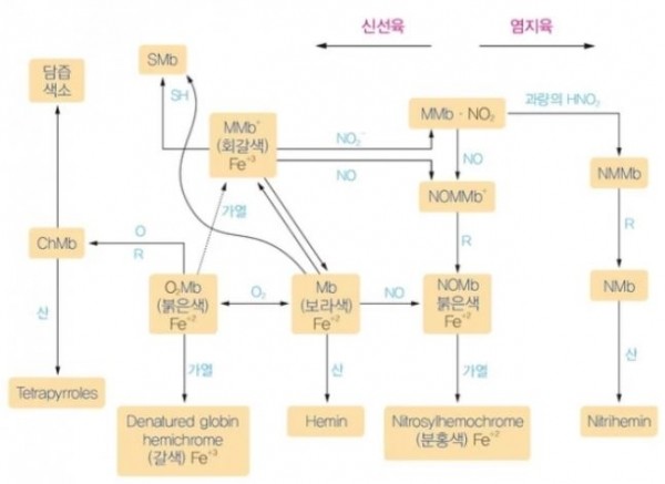 대표적으로 햄과 같이 아질산나트륨으로 보존 처리된 육가공 식품에서 열이 가해졌을 때 붉은 색의 선 분홍빛이 나타나는 이유다.