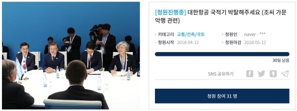 논란이 커지자 조 전무는 12일 자신의 SNS에 "어리석고 경솔한 행동에 대해 사과드린다”며 고개를 숙였지만 여론은 여전히 싸늘하다. 13일 오후 5시 현재 조 전무와 관련해 청와대 청원 게시판에 올라온 비판글이 30여건에 달한다.