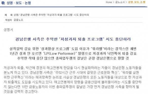 또 6개월의 자구기간 이후 대상자는 ‘LP(Low Perfoemer)’라는 별도의 직책으로 분류되는데, 노조는 이를 “‘저성과자’라는 낙인을 찍어 모욕을 줌으로써 퇴직을 강요하겠다는 것”이라며 “결국 사측은 저성과자 퇴출이 목표인 것”이라고 주장했다.