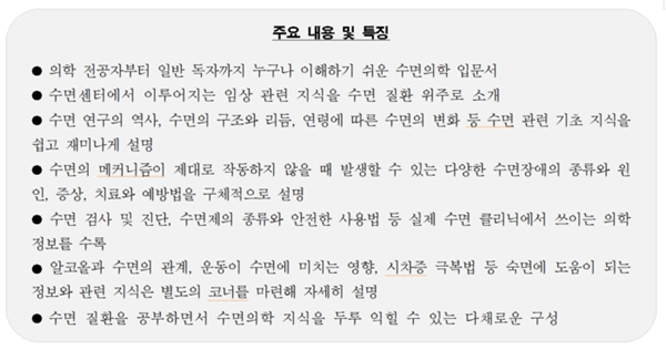 그런 점에서 ‘내 몸 안의 잠의 원리, 수면의학’은 맘 편히 푹 자고 싶은 현대인에게 꼭 필요한 수면의학의 기초 지식을 전하는 필독서라 하겠다. 아무쪼록 이 책을 통해 수면의 메커니즘을 이해하고, 나아가 독자 여러분이 쾌적한 수면을 이루는 데 조금이나마 도움이 되기를 바란다.