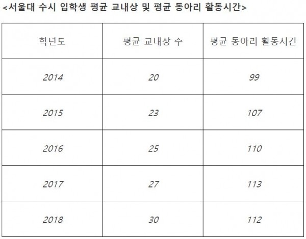 학생부 종합전형은 박근혜 정부인 2014년 도입되어 2015년부터 적용되었고, 학생부 종합전형이 도입된 이후 서울대 수시 합격생들의 고교 시절 학교생활기록부에 기록된 교내상은 매년 증가한 것으로 보인다.