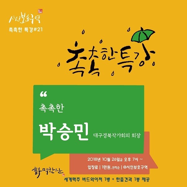이번 ‘촉촉한 특강’은 ‘詩맥한잔’이라는 소주제를 가지고 대구경북작가회의 지회장 박승민과 함께, 시 낭독을 겸한 세계맥주 파티를 연다. 행사는 시인 박승민의 시를 노래로 하는 詩린입술 공연, 대구시낭송예술협회 회원들의 시 낭독 무대 그리고 시인이 직접 육성으로 들려주는 시 낭독 순으로 이루어진다.