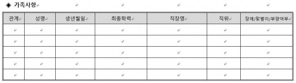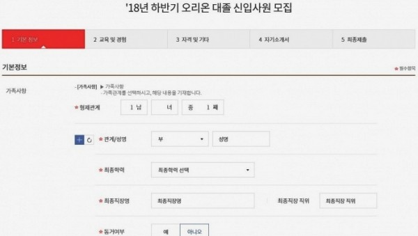 <일요주간> 취재결과 오리온의 2015년 신입사원 입사지원서에도 가족들의 최종학력과 직장명, 직위 등을 작성하는 항목이 있었던 것으로 확인됐다.