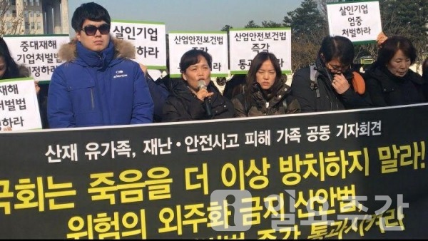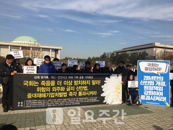 그러면서 "산업재해로 가족을 잃은 유가족과 산재 피해가족, 재난과 안전사고로 다치고 돌아가신 피해자의 가족들이 이러한 일을 방치해 온 국회를 규탄한다"면서 위험의 외주화를 막을 산업안전법과 중대재해 예방을 위한 중대재해기업처벌법 즉각 통과를 요구했다.